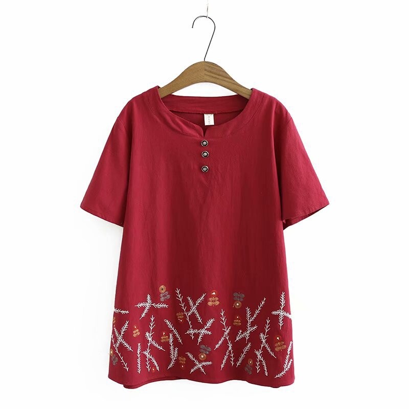 加大码白色红色女式花朵刺绣衬衫短袖夏季衬衫复古上衣